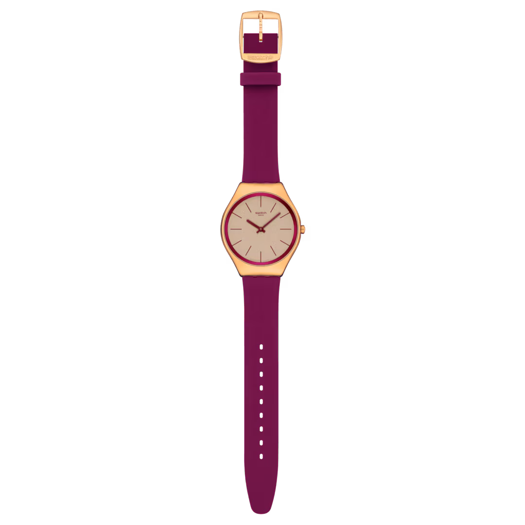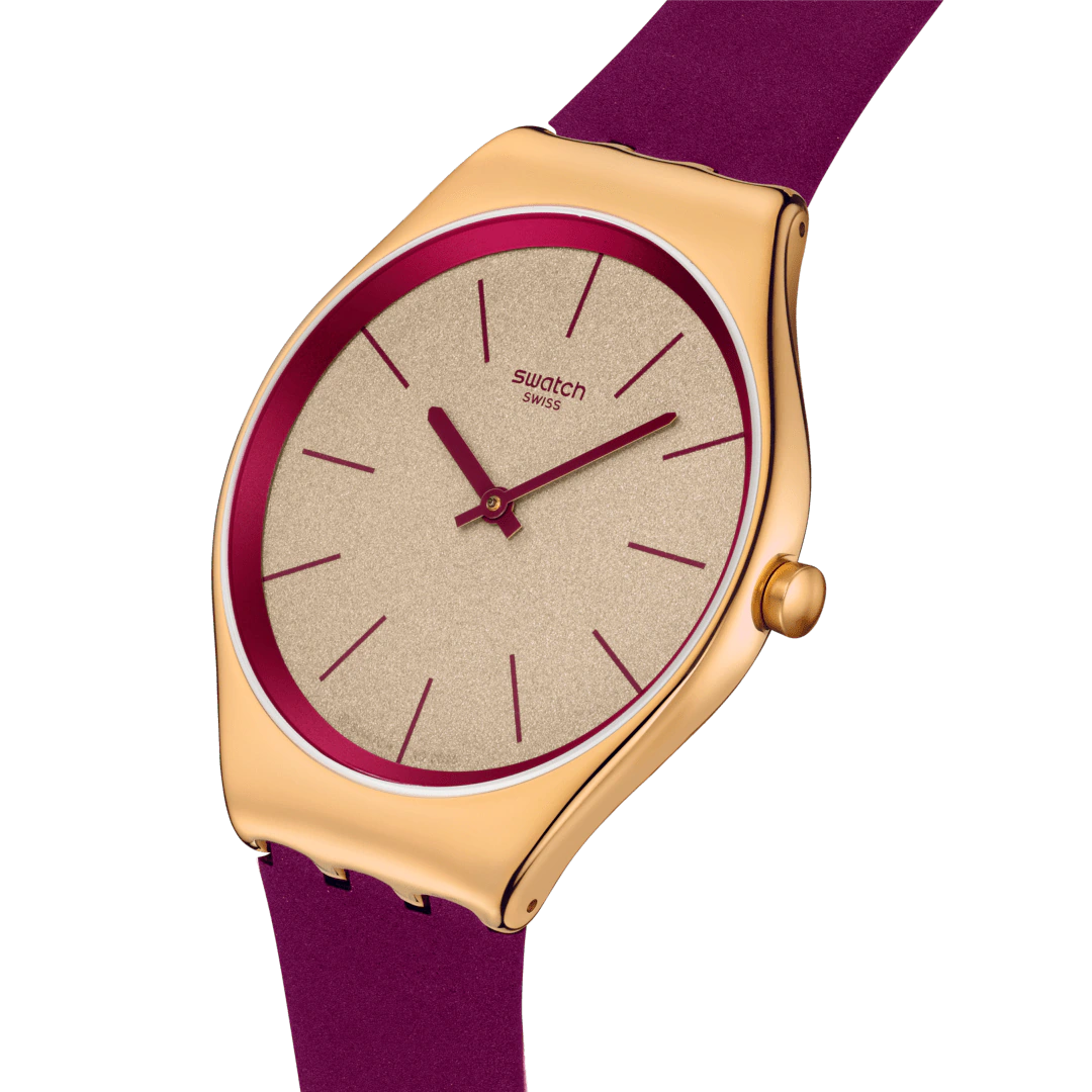 Diese ultraschmale Uhr verfügt über ein goldfarbenes Zifferblatt mit Glitzereffekt und gedruckte Stundenmarkierungen, einen Höhenring sowie Stunden- und Minutenzeiger in dunklem Rosa. Das Gehäuse aus poliertem Edelstahl mit einer roségoldfarbenen PVD-Beschichtung wird durch ein passendes Armband mit Schließe und eine Schlaufe in dunklem Rosa ergänzt.