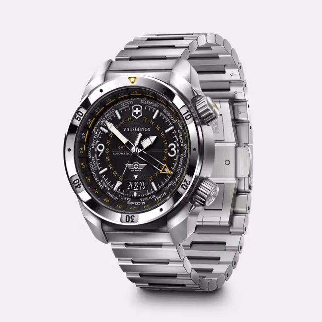 Die Air Pro Automatic ist ein flugtauglicher Zeitmesser für Präzision und Widerstandsfähigkeit. Das dreidimensionale Zifferblatt ermöglicht das Ablesen von drei Zeitzonen, wobei die zweite Zeitzone über einen eigenen GMT-Zeiger angezeigt wird. Angetrieben von dem Swiss Made Sellita SW330-2 Automatikwerk mit einer Gangreserve von 56 Stunden, verfügt sie über zwei Kronen: eine verschraubte Krone auf 4 Uhr und eine zweite Krone auf 2 Uhr für die GMT-Funktionen. Sie bietet ISO-zertifizierte Stosssicherheit und Wasserdichtigkeit bis zu 200 m, zusätzlich übergrosse Zeiger und Markierungen mit Swiss Super-LumiNova®-Technologie.