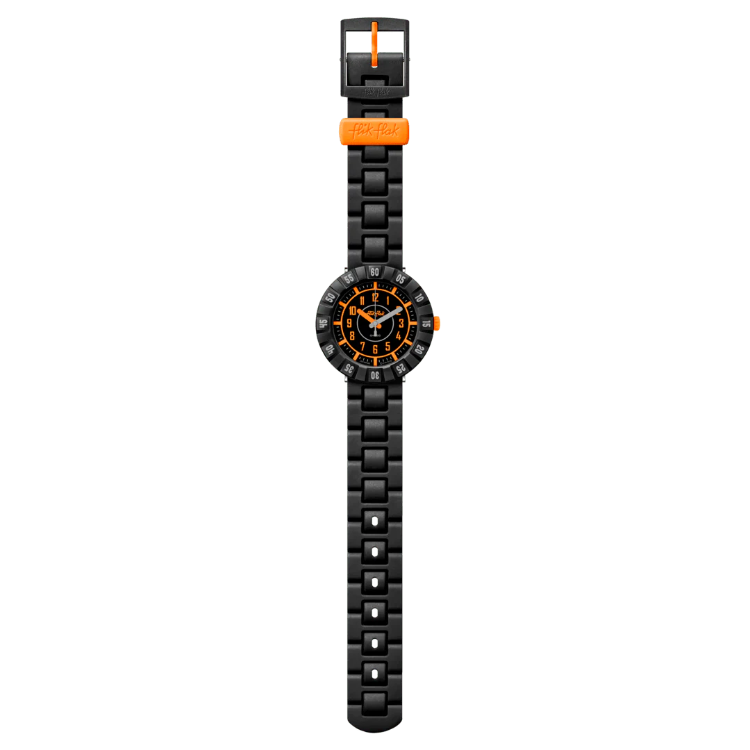 Eine umwerfende Kombination von mysteriösem Schwarz und orangefarbenen Neon-Elementen: die CATCH U ist der perfekte Partner, wenn du in deinen Träumen im Cockpit eines Raumschiffes fliegst. Mit den Neon-Details auf dem Zifferblatt entlang der sich drehenden Lünette wird das Lernen der Uhrzeit zum reinsten Kinderspiel!