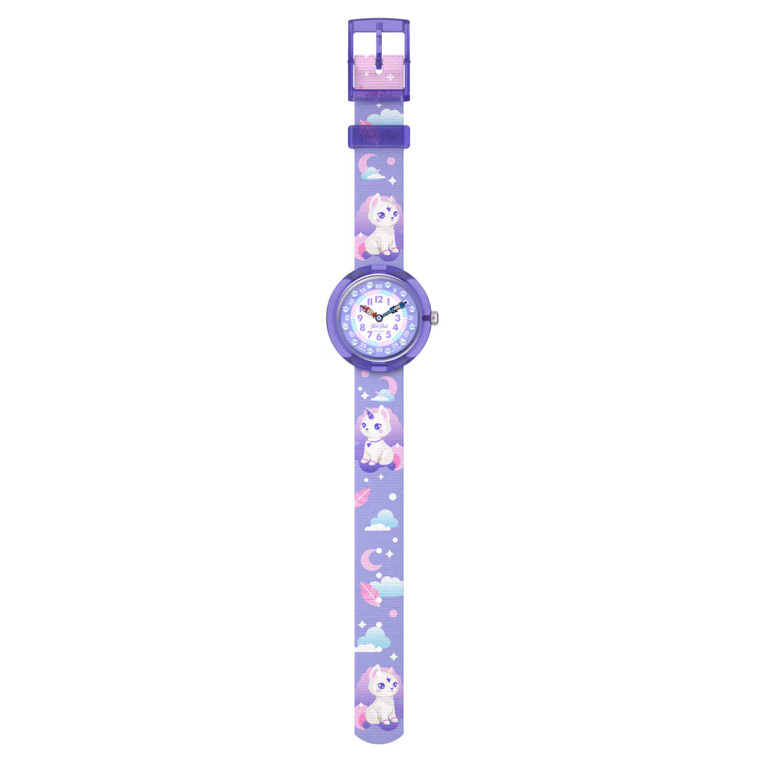 Die bezaubernde Flik Flak COSMICAT zeigt ein Einhornkätzchen inmitten eines verträumten lilafarbenen Himmels, umgeben von Wolken aus Zuckerwatte. Sie ist mit Kristallsteinchen verziert und macht die Lernzeit zu einem magischen Vergnügen. Das perfekte Geschenk für fantasievolle Kinder!