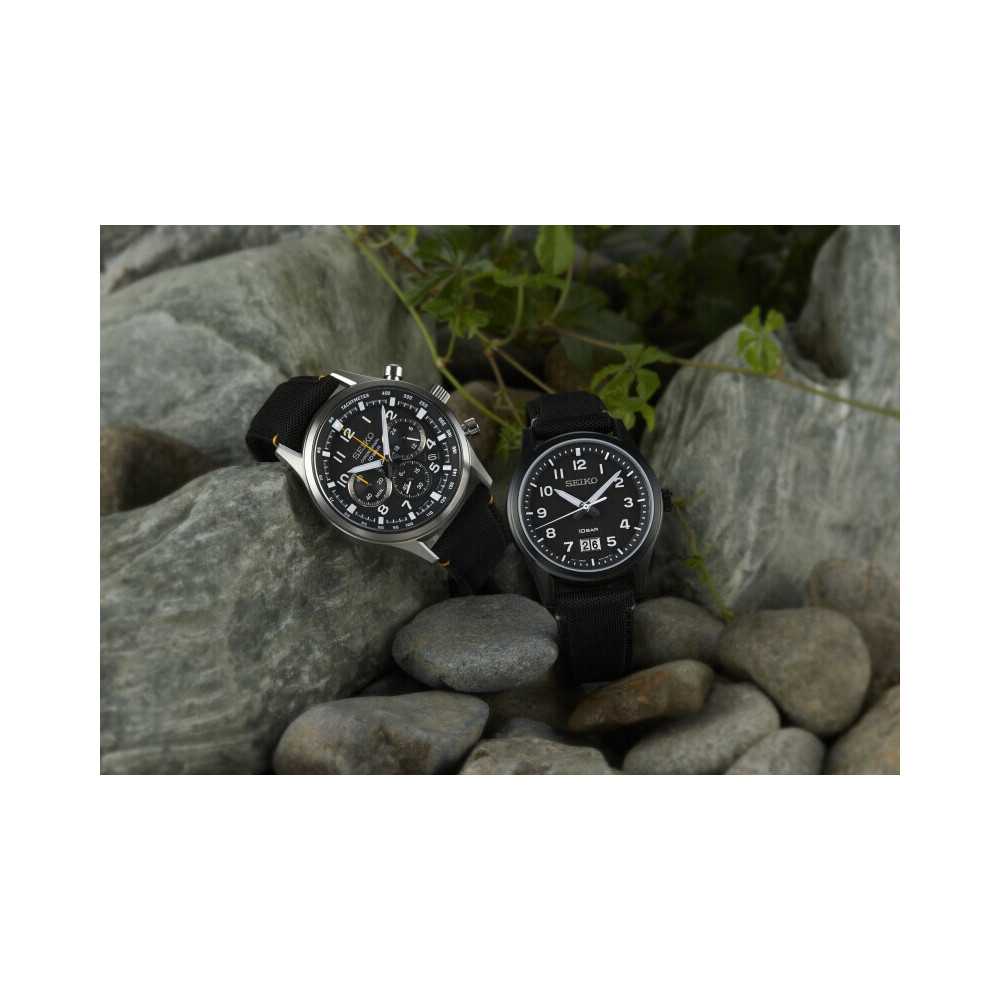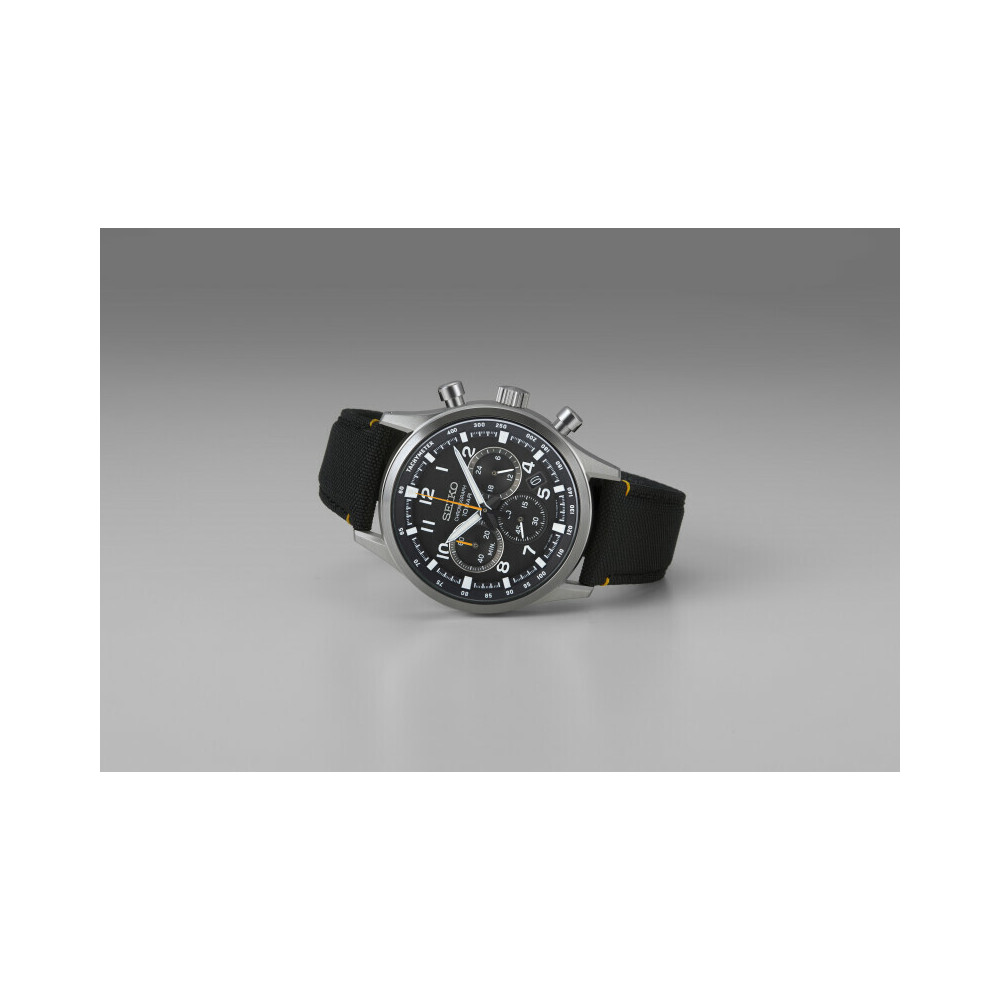 Diese Quarzuhr aus der Kollektion Seiko SPORT Kollektion bietet eine ganze Reihe an Funktionen. Das schwarze Zifferblatt verfügt über die drei Chronographenzähler und ist von einer Tachymeterlünette umgeben. Dieses komplett aus Edelstahl gefertigte Modell ist mit seinem Hardlexglas, dem verschraubten Gehäuseboden und seiner Wasserdichtigkeit bis 100 Meter zudem sehr robust.
