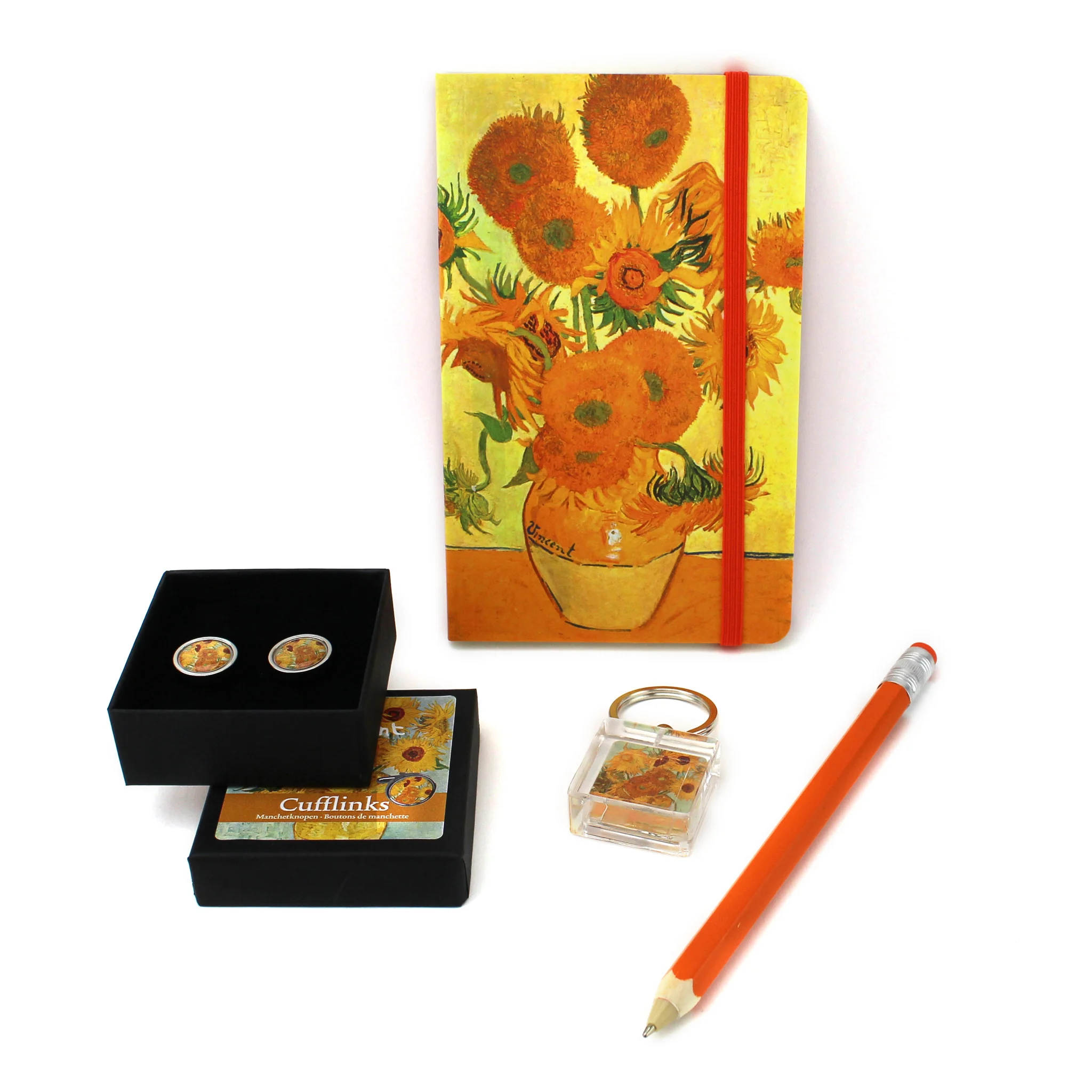 Dieses Geschenkset enthält mehrere Produkte mit dem Bild der von Vincent van Gogh gemalten Sonnenblumen: einen Schlüsselring, ein Softcover-Buch und einen hölzernen Kugelschreiber sowie ein Manschettenknopfset. Das Geschenkset ist in transparentes Papier
