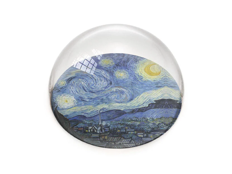 Runder Briefbeschwerer aus Glas in schwarzer Geschenkbox.Mit einem Druck des weltberühmten Gemäldes von Vincent van Gogh: Die sternenklare Nacht.