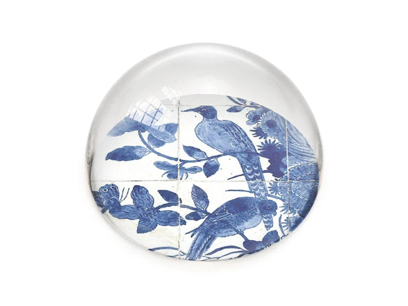 Runder Briefbeschwerer aus Glas in schwarzer Geschenkbox.Mit einem Druck eines blauen Delfter Fliesentableaus im Rijksmuseum in Amsterdam.