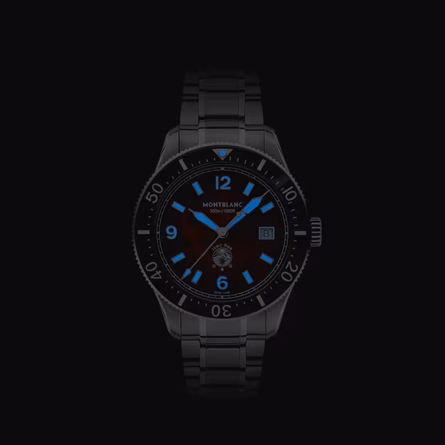 Die Montblanc Iced Sea Automatic Date verfügt über ein bordeauxfarbenes Zifferblatt mit Gletschermuster, das an die tiefrote Farbe der Abendsonne erinnert, die auf den Gletscher strahlt. Das Zifferblatt mit Gletschermuster ist vom Mer de Glace inspiriert, dem Hauptgletscher des Mont Blanc Massivs. Seine Textur wurde mithilfe einer nahezu in Vergessenheit geratenen Technik erhalten, dem „gratté-boisé“. Die Uhr verfügt über eine einseitig drehbare schwarze Keramiklünette, eine 3D-Gravur auf dem Gehäuseboden und ein austauschbares Edelstahlarmband mit Feineinstellung. Die Uhr erfüllt die Anforderungen der ISO 6425 Norm für Gerätetauchen und ist wasserdicht bis 300 Meter.