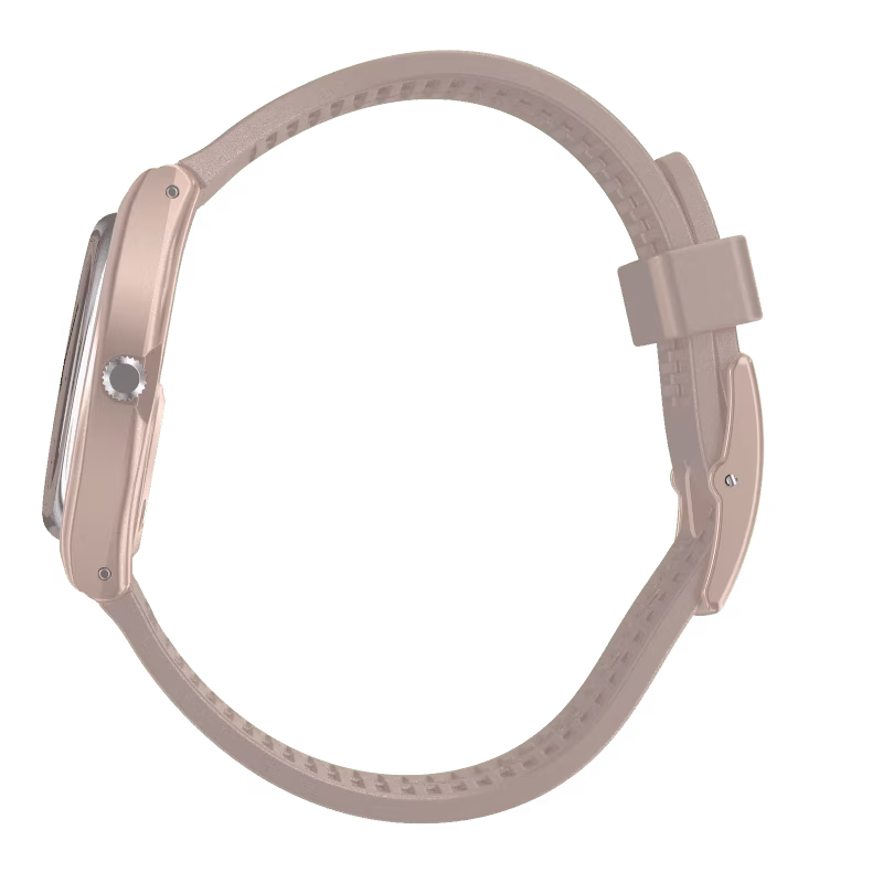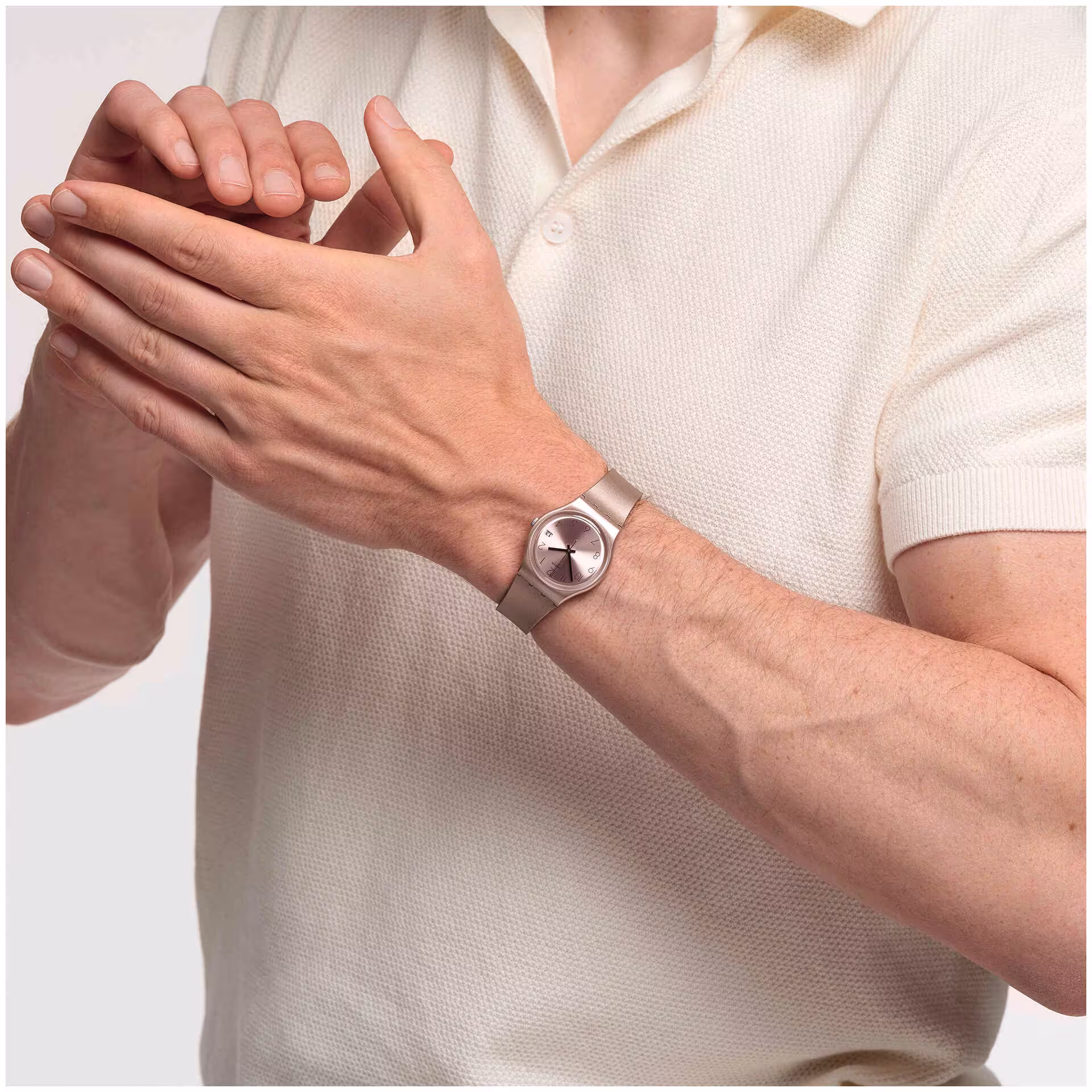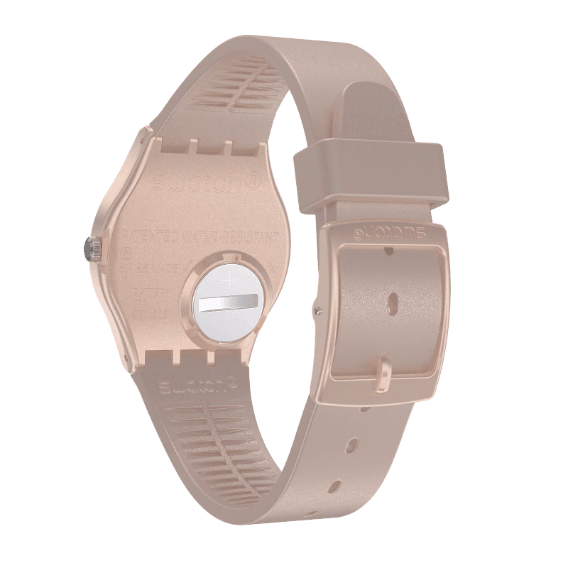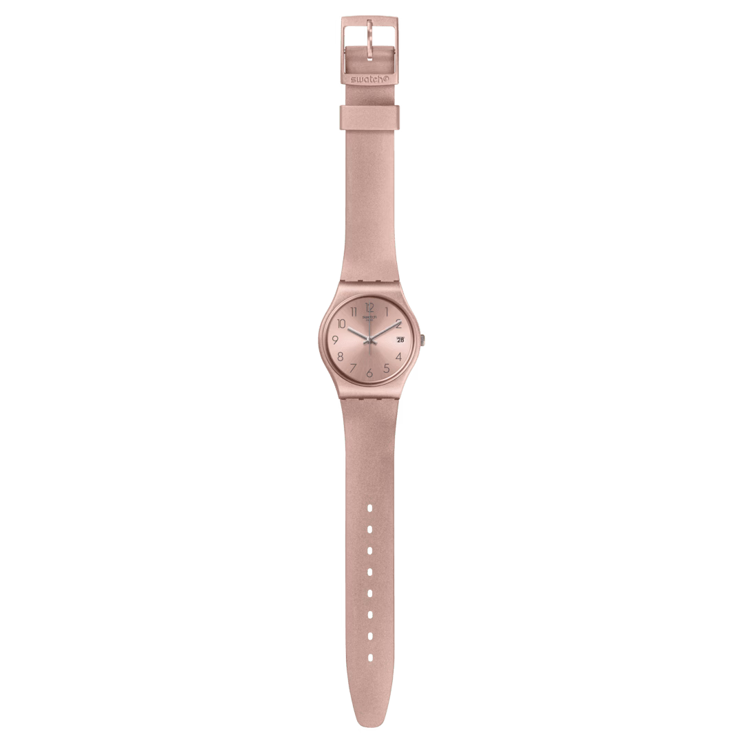 Die PINKBAYA (GP403) in Blassrosa sorgt mit einem metallisierten Kunststoffarmband und einem passenden rosa Zifferblatt mit Sonnenschliff und Datumsanzeige bei 3 Uhr für Aufsehen.