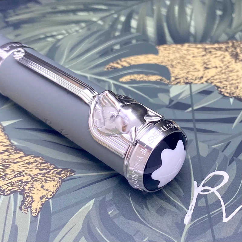 Dieser limitierte Füllfederhalter ist Teil der Montblanc Writers Edition und weltweit auf 10.300 Stück limitiert. Er besticht durch seinen Korpus aus olivfarbenem Harz, einen platinbeschichteten Clip und einen platinbeschichteten Wolfskopf.