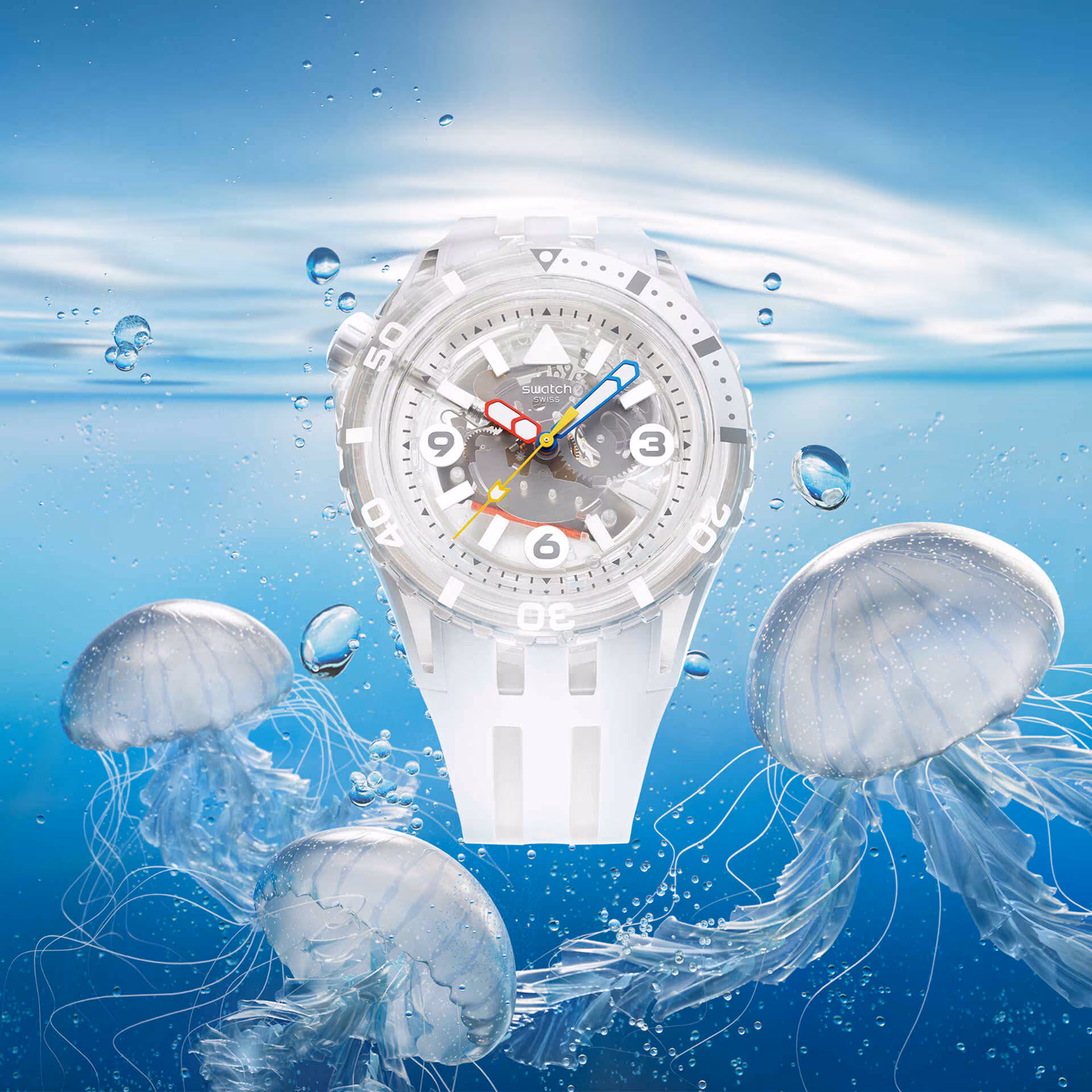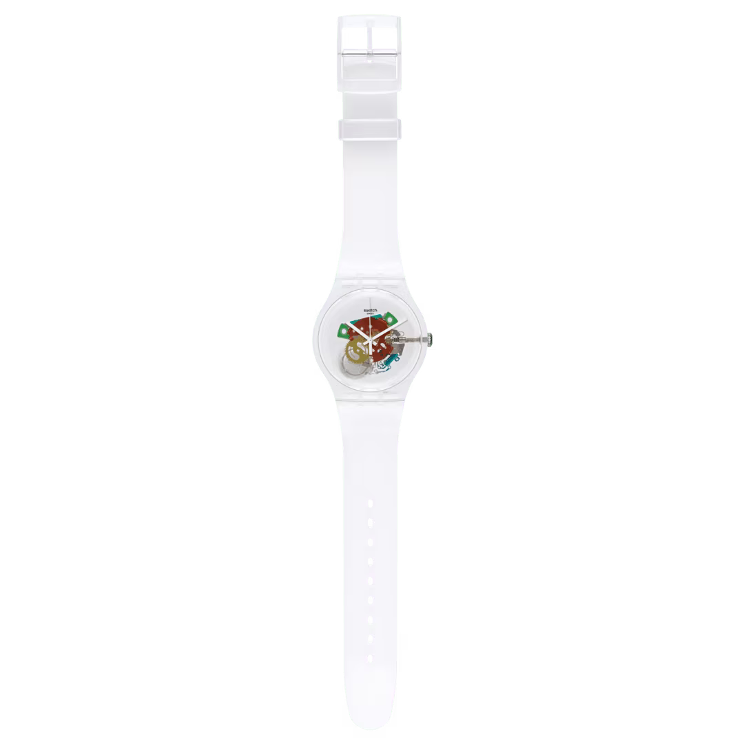 Das transparente Zifferblatt dieser Taucheruhr verfügt über weiße Indizes, graue Ziffern, einen roten Stundenzeiger, einen blauen Minutenzeiger sowie einen gelben Sekundenzeiger, alle fluoreszierend unter biobasiertem Glas. Das Gehäuse kombiniert mattweißes Bioceramic und glänzend-transparentes biobasiertes Material. Es ist mit einer transparent glänzenden biobasierten Lünette mit grau-weißem Print, der im Dunkeln leuchtet, sowie einer Krone aus mattweißem Bioceramic bei 10 Uhr ausgestattet. Abgerundet wird das Modell mit einem mattweißen und matt-transparenten Armband mit einer mattweißen Schlaufe und einer transparent glänzenden biobasierten Schließe.
