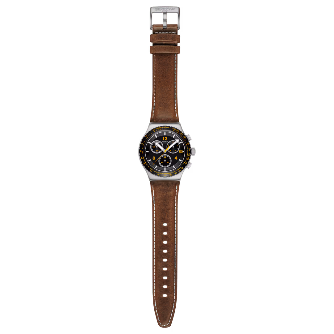 Dieser Edelstahl-Chronograph verfügt über ein schwarzes Zifferblatt mit Sonnenschliff, gelbe aufgedruckte Ziffern, fluoreszierende Indizes und ein gelbes Datumsfenster mit schwarzem Print bei 3 Uhr. Fluoreszierende silberfarbene Stunden- und Minutenzeiger in Pfeilform und ein gelber Chronographen-Sekundenzeiger zeigen die Zeit an. Außerdem ist der Chronograph mit einem Gehäuse und einer Lünette aus gebürstetem Edelstahl mit schwarzer PVD-Beschichtung und einer gelben Tachymeter-Skala ausgestattet. Vervollständigt wird die Uhr durch ein braunes Lederarmband mit Kontrastnähten, braune Lederschlaufen und eine Halbschließe aus gebürstetem Edelstahl.