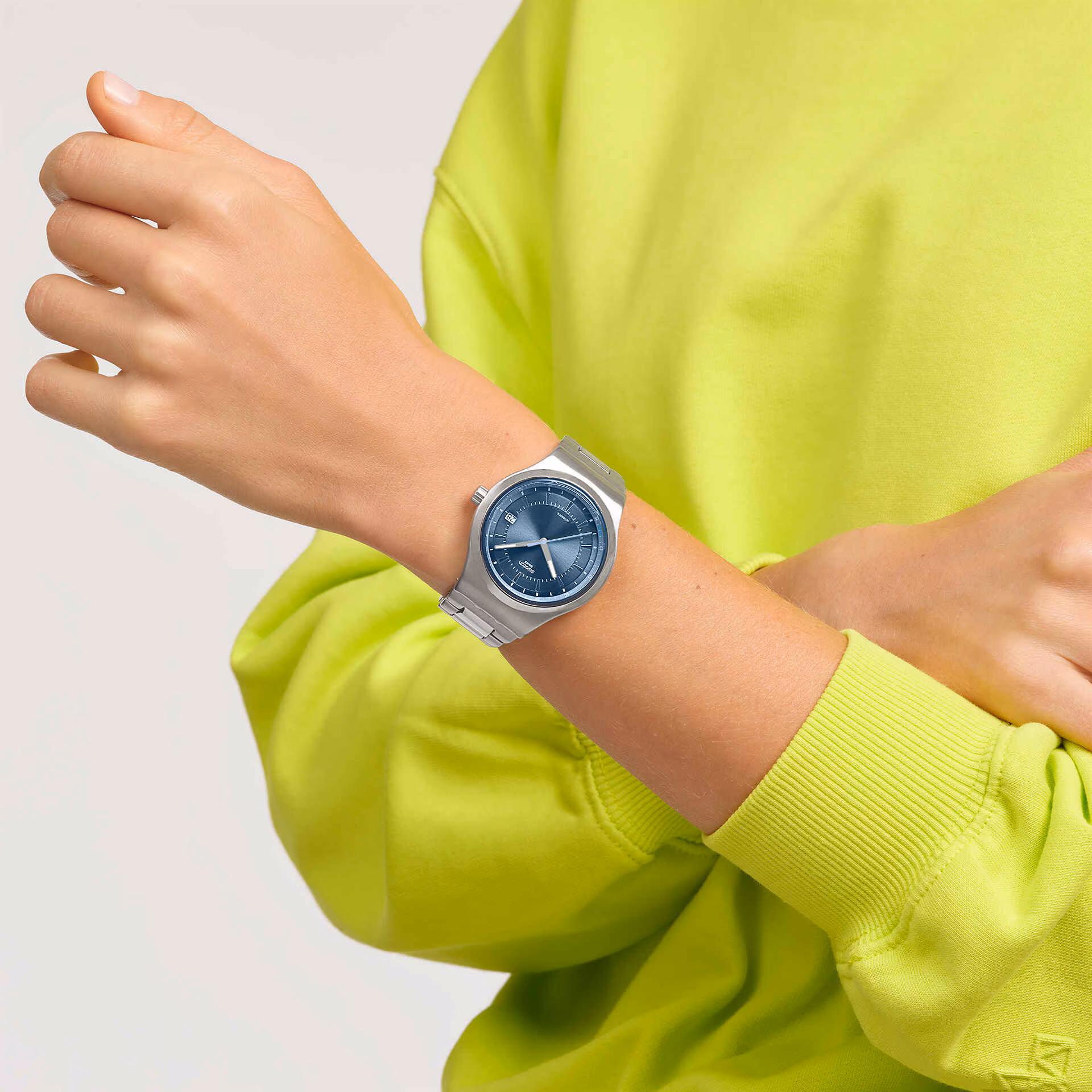 Diese elegante Automatikuhr verfügt über ein blaues Zifferblatt mit Sonnenschliff, silberfarbene fluoreszierende Indizes, Stunden- und Minutenzeiger, einen hellblauen Sekundenzeiger, einen hellblauen Außenring mit weißer Minutenteilung sowie ein weißes Datumsfenster mit schwarzem Print bei 3 Uhr. Das Gehäuse aus gebürstetem Edelstahl wird durch eine Lünette aus glänzendem Edelstahl ergänzt und gibt durch den Gehäuseboden mit Digitaldruck den Blick auf das SISTEM51-Uhrwerk frei. Abgerundet wird der Look durch ein Edelstahlarmband mit gebürstetem und poliertem Finish sowie einer Schmetterlingsschließe.