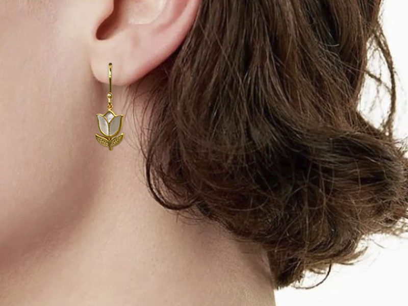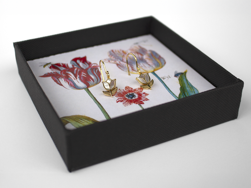 Ein wunderschönes Schmuckstück: Diese „Tulpen“-Ohrringe mit vergoldeten Anhängern in einer luxuriösen Geschenkbox.